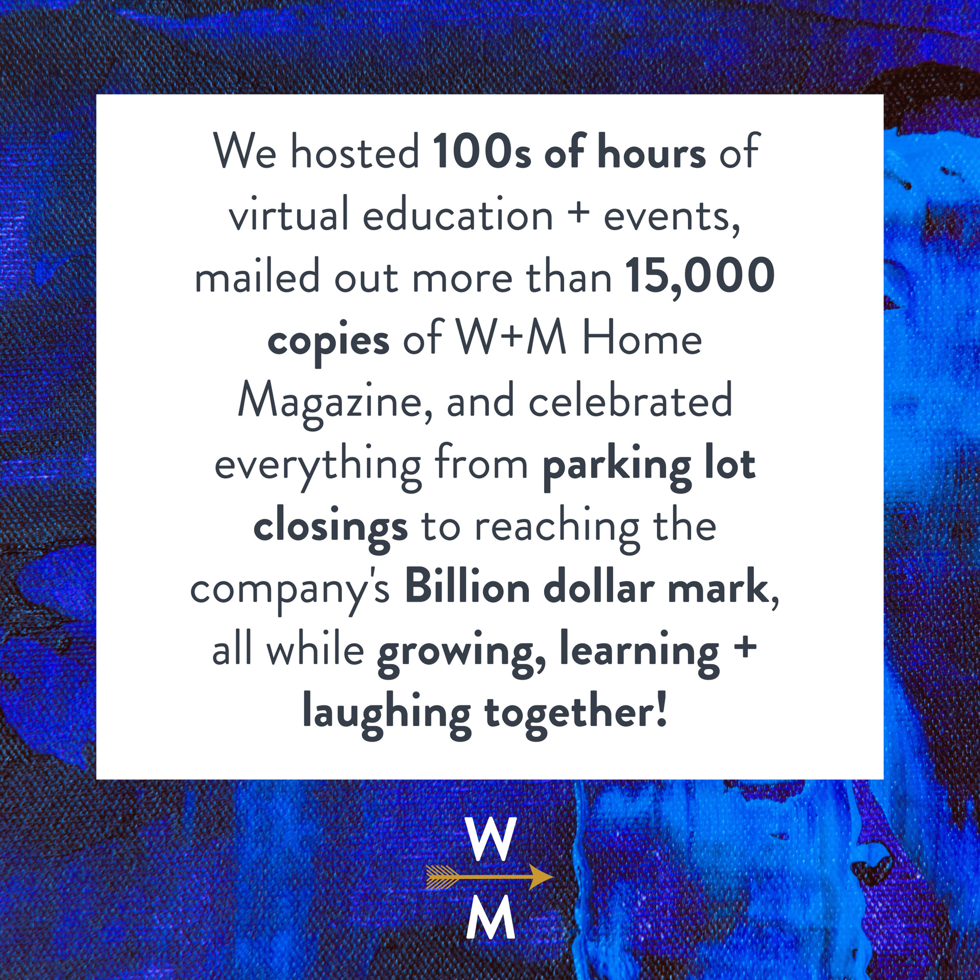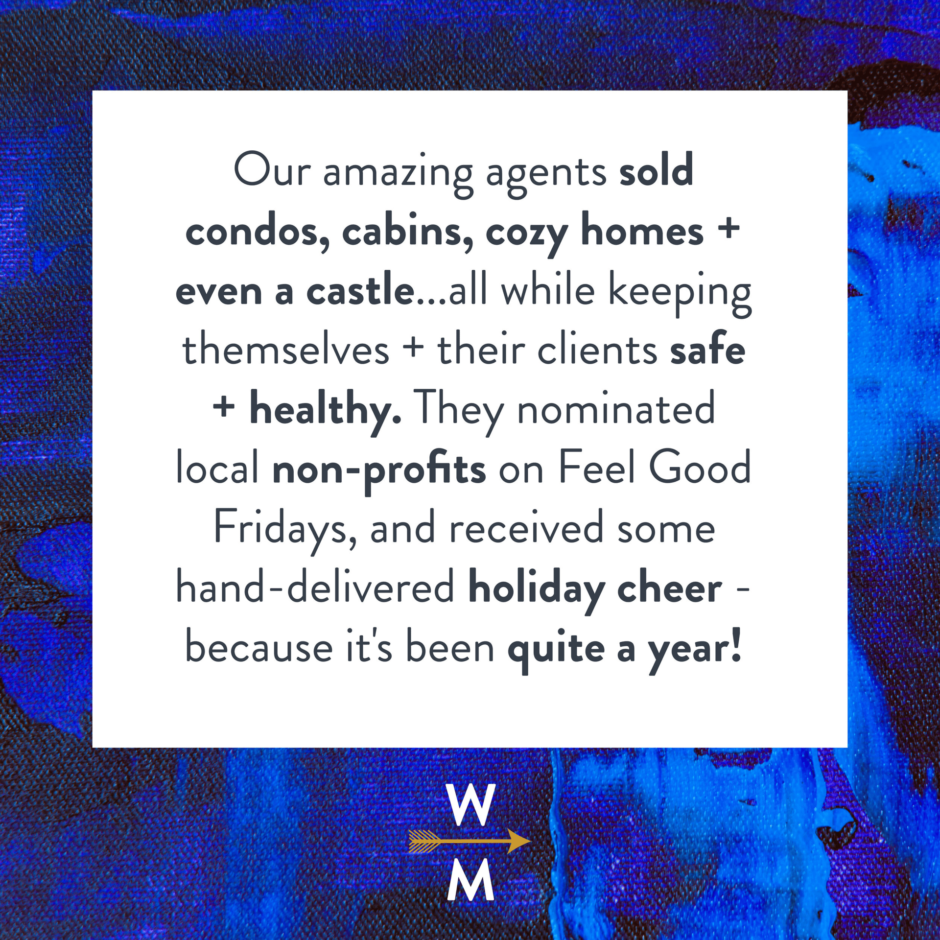 Our agents also inspired so many Company initiatives this year - from the creation of West + Main Home Magazine, which has become one of our most popular marketing assets, to Feel Good Fridays, which has allowed us to learn about and support so many important + worthy local non-profit organizations, and our partnership with the Denver Metro Fair Housing Center, which strives to protect and preserve Fair Housing for all.