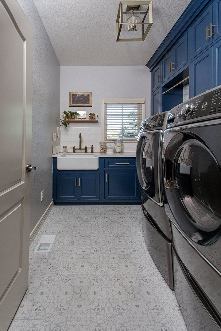 When West + Main agent Steph Christianson set out to remodel her laundry room, she didn’t just settle for a functional space—she turned it into a bold, eye-catching extension of her home’s personality. Inspired by the dark blue cabinetry in her adjacent kitchen, Steph brought the same pop of color into her laundry room, adding depth and drama to a space often overlooked. She invested about $10,000 to achieve the look, including new cabinets, countertops, a farmhouse sink, fresh tile, and a new light fixture.