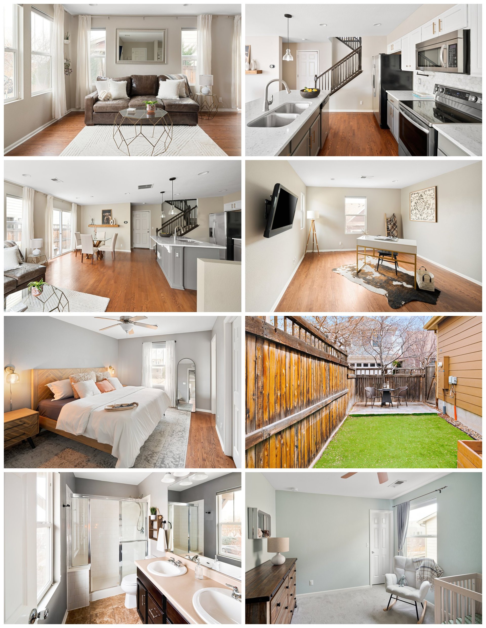The charming front yard oasis with a red maple, roses, and peonies sets the tone before stepping onto the welcoming front porch. Inside, gleaming hardwood floors flow through the open-concept living, dining, and chef’s kitchen. The stunning kitchen boasts quartz countertops, a marble backsplash, stainless steel appliances, a walk-in pantry, and a large island—ideal for entertaining. A powder room and direct access to the two-car attached garage complete the main level. Upstairs, a versatile loft is perfect as a home office, media space, or third bedroom conversion. The primary suite is a serene retreat with abundant light, a spacious closet, and an elegant en-suite 3⁄4 bath. A second bedroom, full bath, linen closet, and a well-organized laundry room add function and storage. When it’s time to soak up that Colorado sunshine, step outside through the sliding doors off the dining area into your private outdoor oasis. Located directly across from Central Park and near 29th Avenue Town Center, Stanley Marketplace, pools, trails, and more, this home offers both scenic beauty and city convenience, with easy access to I-70, Downtown, and DIA.