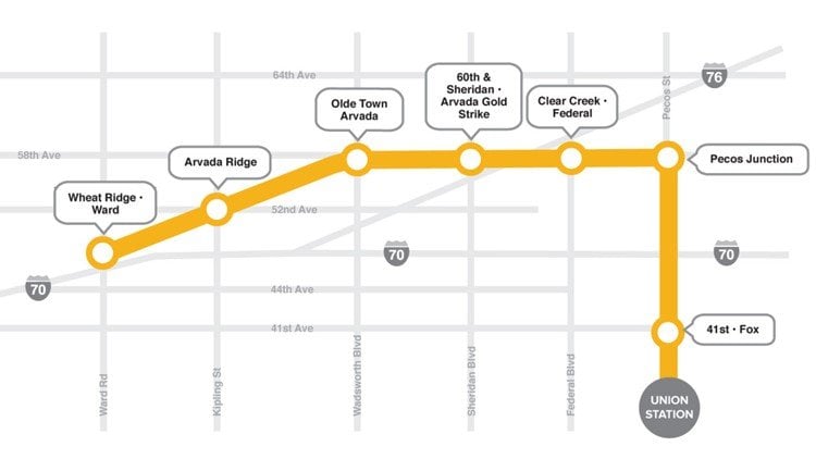 Passengers who start in Denver will get on the train at Union Station and then travel through Arvada before reaching Wheat Ridge. Trains will hit eight stations between the two points. In total, the 11.2-mile ride takes about 27 minutes.