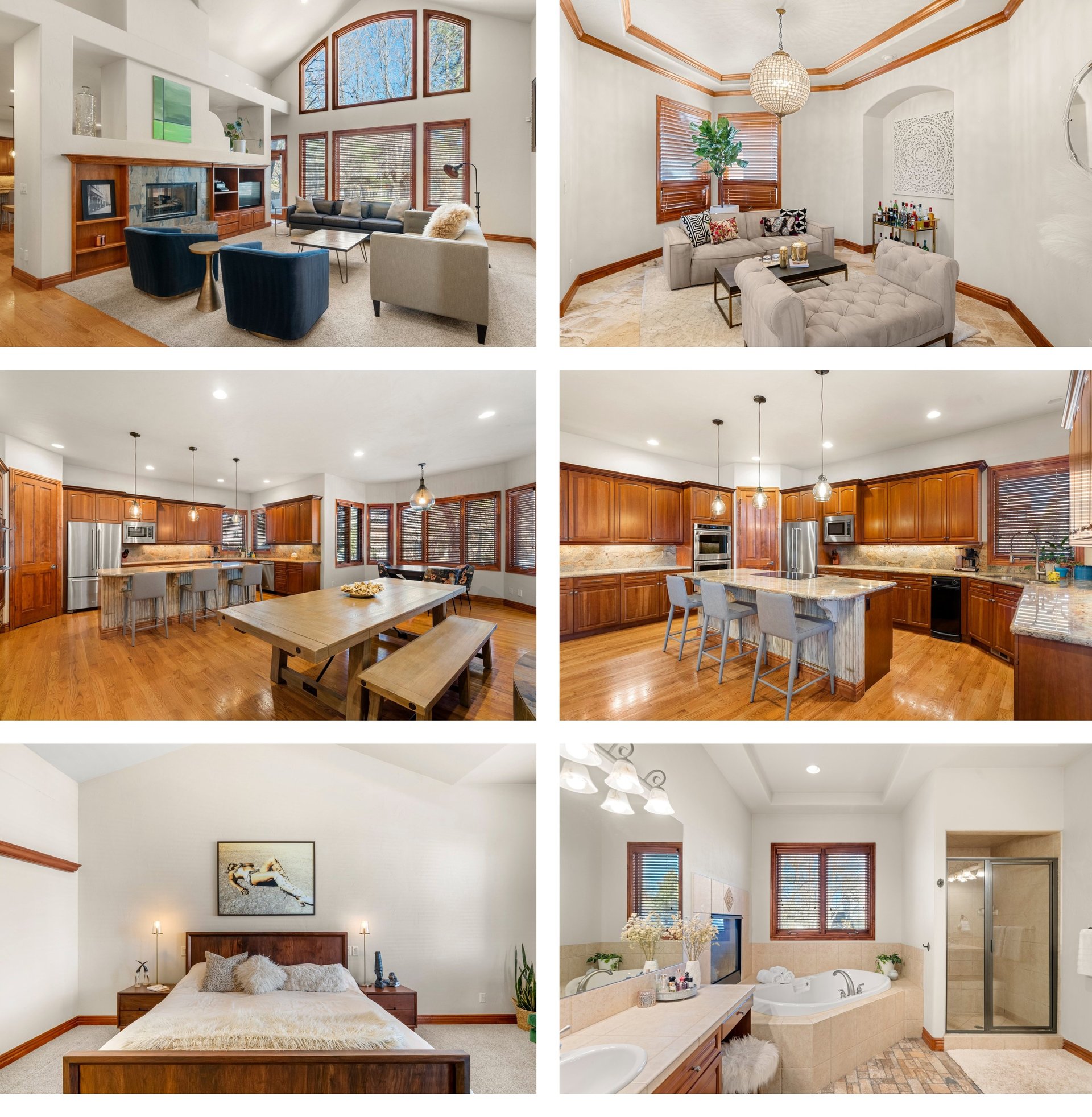 The stylish kitchen is perfect for entertaining, while a central fireplace adds warmth to the main level. A standout feature is the main-floor primary suite with soaring ceilings, an open-sided fireplace, a walk-in closet, and a spa-like ensuite. The main level also offers a spacious office (or second bedroom), while upstairs, three bedrooms each have private baths.