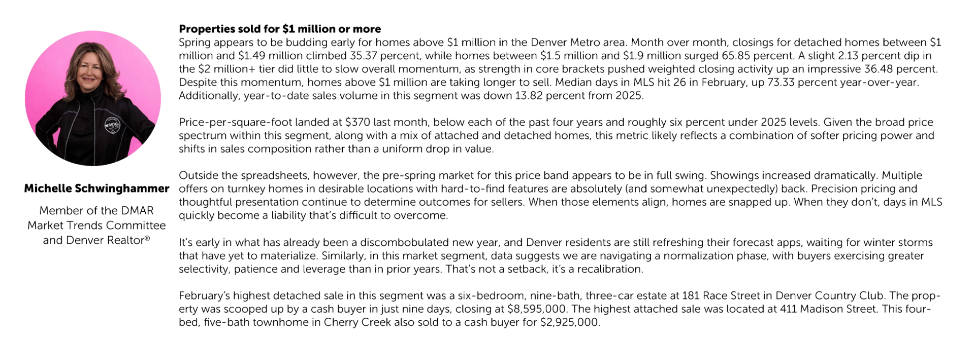 As spring approaches, the Denver Metro market appears well-positioned for an active season. The fundamentals are encouraging, including motivated buyers, improving inventory and pricing that reflects today's realities rather than yesterday's expectations. Sellers who enter the market prepared and priced correctly will find a receptive audience. Buyers who stay focused on their long-term goals rather than short-term rate movements will find real opportunity.