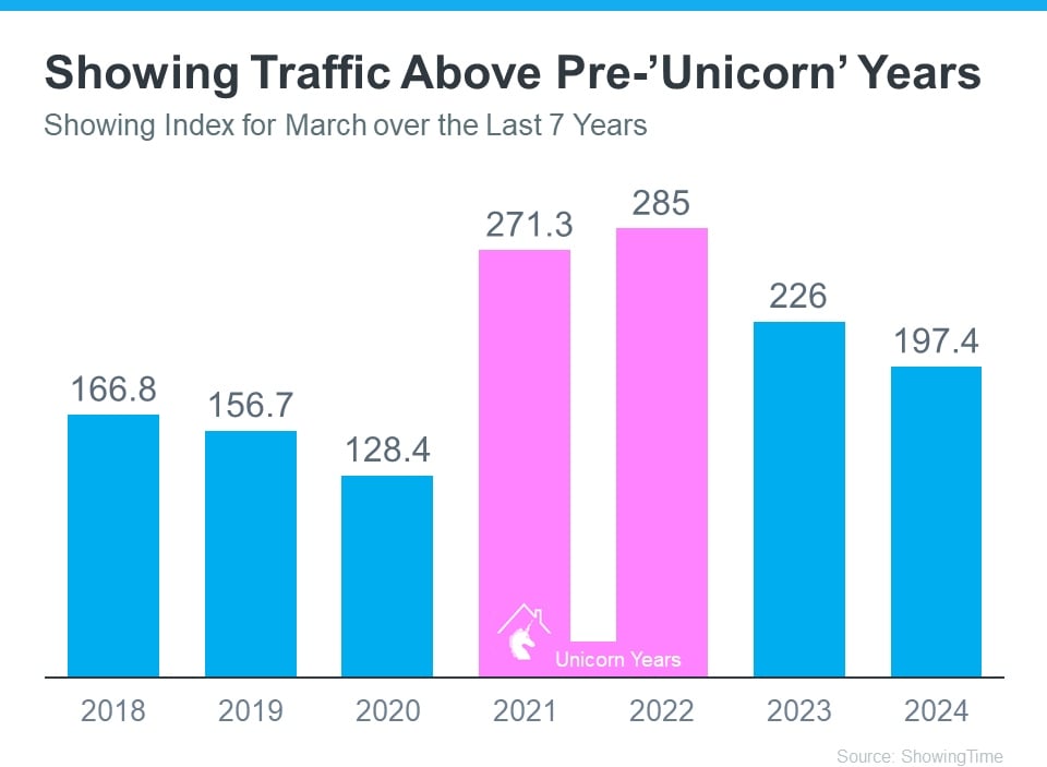 You can see demand has dipped some since the ‘unicorn’ years (shown in pink). That’s in response to a lot of market factors, like higher mortgage rates, rising prices, and limited inventory. But, to really understand today’s demand, you have to compare where we are now with the last normal years in the market (2018-2019) – not the abnormal ‘unicorn’ years.