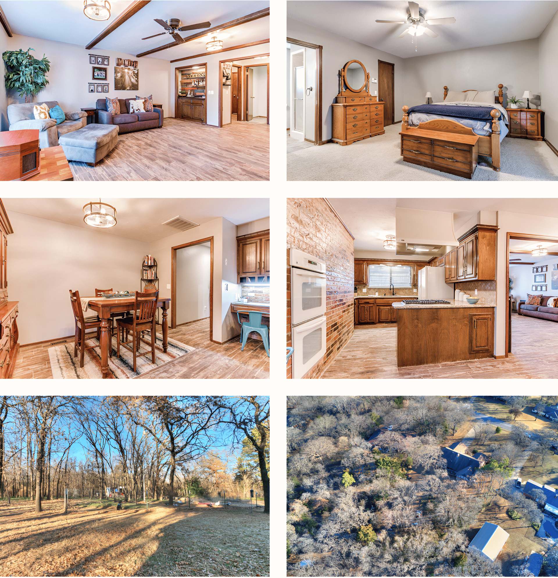 Nestled in the heart of East Edmond, this ranch-style gem is situated on a stunning wooded acre. New roof, gutters, and well pump April 2020! Updates include wood look tile flooring throughout, warm and inviting interior paint, beautiful light fixtures, and ceiling fans in every room. Master suite is spacious and features his and hers closets as well as an en suite bathroom. Three secondary bedrooms offer plenty of room. Second dining converted to study with double door entrance. Main living area features brick fireplace with gorgeous built-ins as well as a vaulted ceiling. Kitchen boasts brick focal wall with built-in double oven, stainless gas range, and adorable desk niche that would be a perfect homework spot or command center for bills and such. Living room off kitchen is flooded with natural light and is complete with wet bar area that would make entertaining a breeze. No HOA so shop buildings and chickens are allowed!