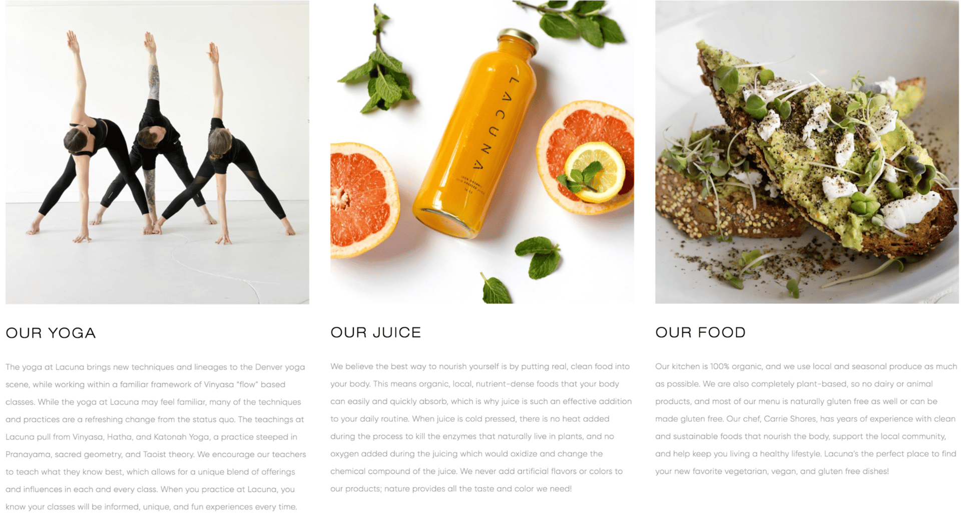 Lacuna Juice and Yoga! Original concept and located at S*park in RINO. I’m a member. We are Denver's only yoga studio offering a fully organic, vegetarian, and vegan restaurant and juice bar. - Leilani Renteria