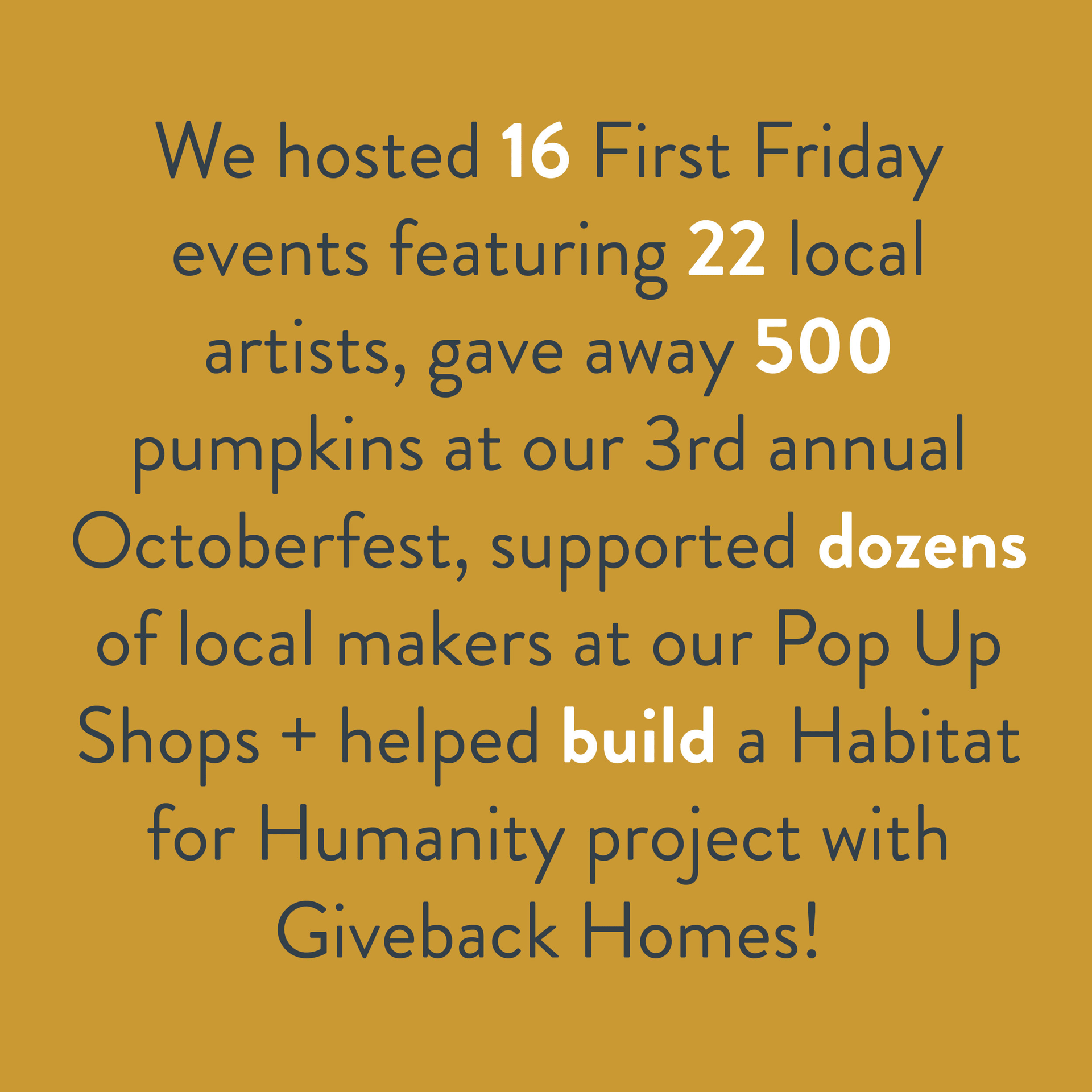 We’re proud to note that partnerships and sponsorships with both international + local non-profit organizations, including Giveback Homes, Habitat for Humanity, Vitalant Blood Center, and RiNo Crush Walls, have provided our agents with opportunities to contribute, learn + grow both personally + professionally. Our commitment to supporting local artists and makers through free gallery space, pop-up shops, and artwalk events is ongoing as well.