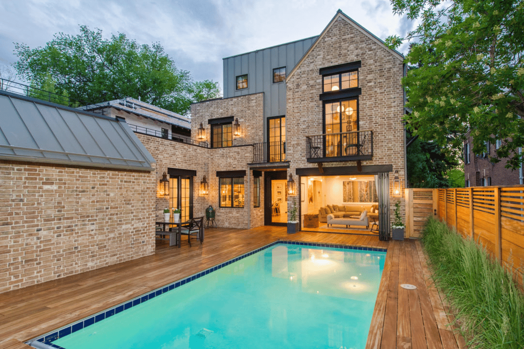 Situated on a coveted lot just across from the park, the modern home was designed and built by Carlos Alvarez of Alvarez Morris Architectural Studio, and Stephen Stone and Matthew Pierce of Character Builders. The exterior features handmade bricks from North Carolina, set in an exacting—and eye catching—pattern. A three-story mahogany-slat “screen” on the front facade’s A-frame-inspired form provides privacy and helps the streamlined structure blend with the neighborhood’s aesthetic—with a nod to modern design. At the rear of the property, a matching mahogany deck surrounds a heated outdoor pool.