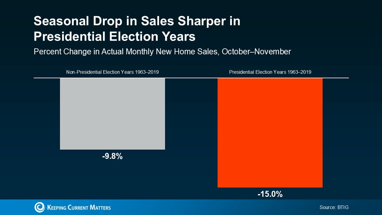 In any given year, home sales slow down slightly in the fall. It’s a typical, seasonal trend. However, according to data from BTIG, in election years there’s usually a slightly larger dip in home sales in the month leading up to Election Day (see graph below):