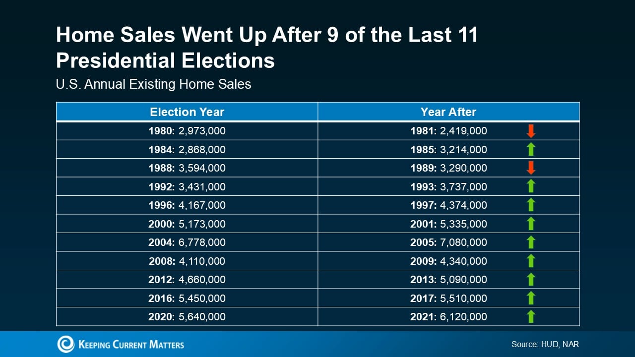 The good news is these delayed sales aren’t lost forever—they’re just postponed. History shows sales tend to rebound after the election is over. In fact, home sales have actually increased 82% of the time in the year after the election (see chart below):
