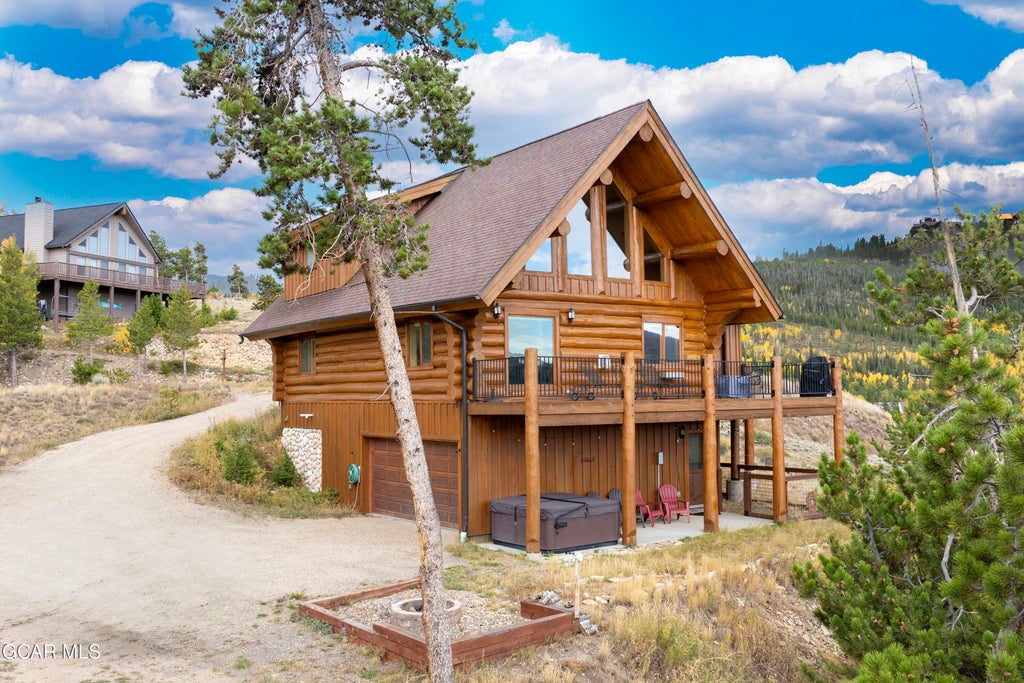 This charming log home in Innsbruck offers stunning top-of-the-world views and a perfect mountain retreat. It features 3 bedrooms and 3 bathrooms, an open kitchen with stainless appliances, European oak floors, and modern updates. Enjoy outdoor living on the large deck with mountain and sunset vistas, relax in the hot tub, or watch your dog run in the designated area. The home also includes a cozy fireplace with stacked rock surround, a remodeled master bath with heated tile floors, and updated heating, water systems & exterior stain. Located conveniently near Granby Ranch, Winter Park, and Grand Lake, this home is ideal for both relaxation and adventure.