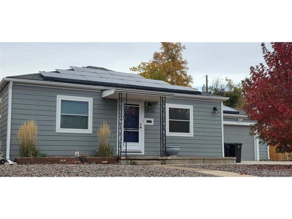 Welcome home to this beautifully updated property featuring James Hardie siding and a new roof for lasting durability and peace of mind. Enjoy solar panels that help offset your Xcel Energy bill, making this home both eco-friendly and cost-efficient. Inside, you'll find fresh paint throughout, hardwood and tile flooring, and double-pane windows that bring in natural light while enhancing energy efficiency. The spacious laundry room comes equipped with a smart washer and dryer, and the primary bedroom offers a private 3/4 bath ensuite with a new vanity. Two additional bedrooms provide plenty of flexibility for roommates, guests, or a home office. Outside, the xeriscaped front yard with decorative rock and a mature maple tree creates great curb appeal, while the fenced backyard is a gardener's dream - complete with sprinklers, a garden area, blooming irises and roses, and a covered patio perfect for relaxing or entertaining. A one-car attached garage and new front door with an electronic lock complete this move-in-ready gem.