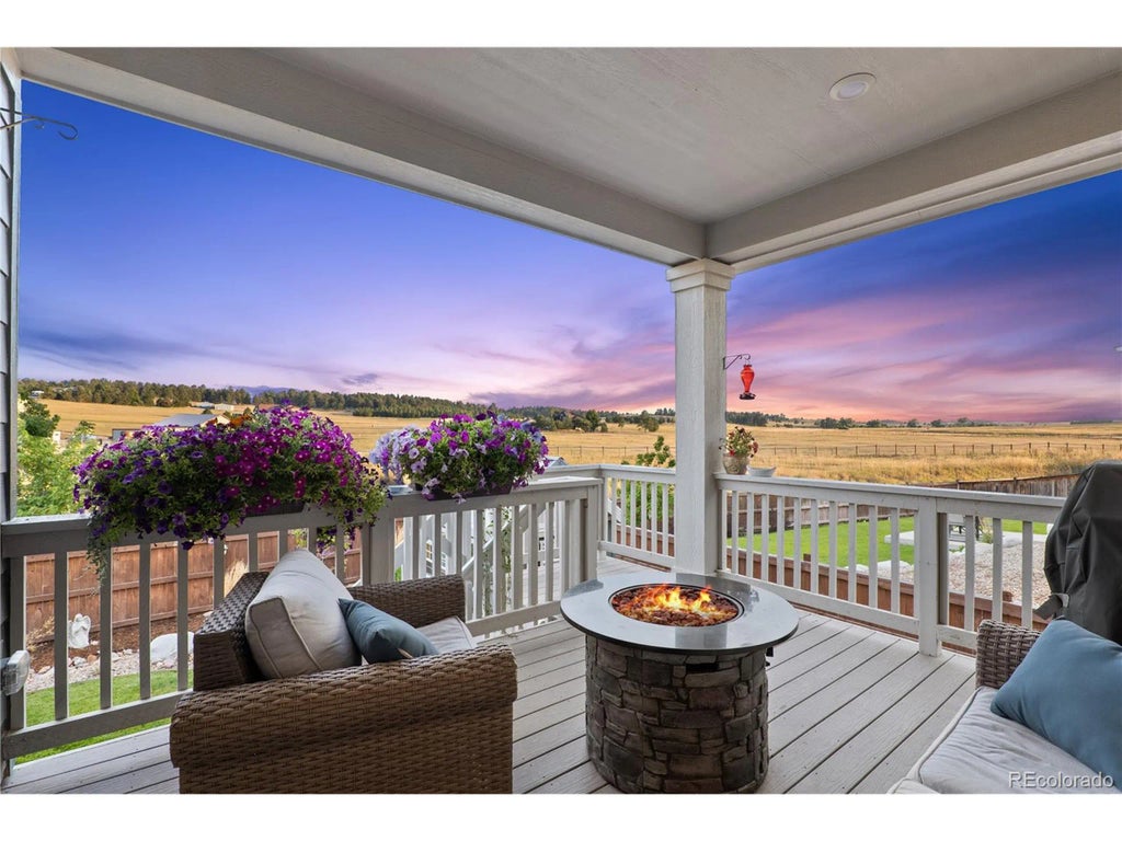 Covered rear porch with stunning views of Pikes Peak, pines, and plains.