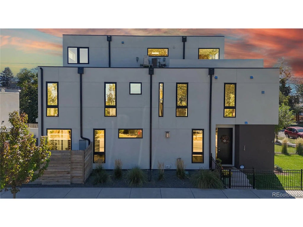 The perfect, like-new contemporary townhome with striking mountain views and sunsets from the private rooftop patio and retreat room with a wet bar and a secluded bedroom with murphy bed ideal for guests or use as office on the private 3rd floor! The open concept main floor plan includes a gourmet kitchen open to dining and living area with quartz composite counters, 5 burner gas stove/convection oven, pantry with pullout drawers and an over-sized island with breakfast bar and waterfall edge. Full height sliding glass door opens to wonderfully spacious private and secluded outdoor patio and backyard with built-in gas fireplace to keep you cozy on those cool nights. Patio and backyard also includes a hot tub, raised garden bed plus a playhouse and sand box for the kids and a storage shed. Second floor spacious primary suite with sitting area is a retreat from the outside world with spacious 5-piece bath complete with soaking tub and oversized frameless glass shower! There are two more bedrooms with full height glass windows overlooking front yard and served by a full bath and a convenient laundry closet in the hall. This home is conveniently located 1/2 block from Rosedale and City of Kunming parks and 2 1/2 blocks from Harvard Gulch Park with soccer fields, volleyball, neighborhood pool, 9-hole golf course, playground and walking/running paths and it is also within just blocks of multiple restaurants and shops on South Broadway. First floor also includes a sunny office/studio in the front with full height glass that overlooks the fenced front yard. Recently painted and custom 2-way blinds (2022), carpeted (2024). Built-in wiring for high-speed internet and audio/visual. Sprinkler system in raised garden bed, front and side.