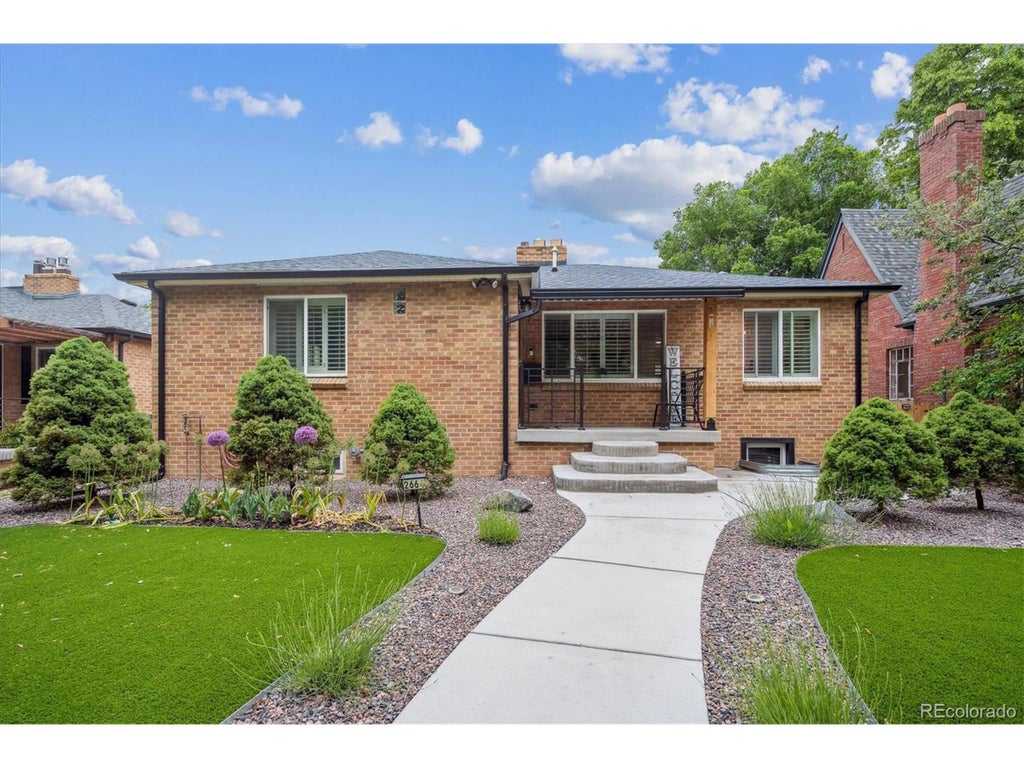 Welcome to this beautifully remodeled Park Hill ranch style home. Located on one of the most popular streets in Park Hill, curb appeal is sure to impress and features large historic trees, professional landscaping, and new concrete. Inside you'll find a convenient mudroom at the front door, leading into an open living area. A large mantle with an electric fireplace overlooks the living room, adorned with custom wood finishes. The eat-in kitchen sits adjacent to the dining area, and features quality stainless steel appliances including a gas range, white quartz counters, white shaker cabinets, a walk-in pantry, and even french doors offering back deck access. The main level boasts 3 bedrooms and one bathroom with dual vanity. The basement features a secondary living room with another fireplace, two additional bathrooms, three additional bedrooms, and a home office with sliding barn door access. The spacious backyard features a trex deck leading our from the kitchen, a patio area perfect for BBQ's, a yard area with astro turf, a large concrete driveway with alley access, and a detached 2 car garage plus a storage shed. This home features updated HVAC including a tankless water heater, and a forced air furnace with central A/C (2022). The roof was replaced in 2022. This home feeds into Park Hill Elementary and East High School.