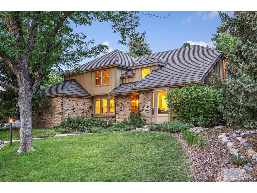 The Hills at Cherry Creek-This is the one! Stunning home offers 6 bedrooms,5 bathrooms w/ over 4,700 sq.ft. of beautifully finished living space. With fresh paint & gorgeous hardwood floors throughout; move-in ready & full of charm. Step inside the impressive foyer with vaulted ceilings, opening to a spacious formal living room with French doors (perfect as a private study) and a stylish dining room with updated lighting. Featuring a main-level bedroom with a private covered deck, perfect for guests, or home office. The inviting family room features vaulted ceilings, skylights, and a cozy gas fireplace. The updated kitchen with warm white cabinetry, granite counters, newer appliances & spacious eat-in area, a wonderful place to gather, cook meals & make memories. Just off the kitchen, you'll find a convenient mudroom/laundry area, 3-car garage access & the second of 2 main-level powder rooms. The upper level boasts 4 generously sized bedrooms including the expansive primary suite with a private balcony, oversized walk-in closet (plus two more!) & a spa-like en-suite bathroom with soaking tub & walk-in shower. Don't miss the fully finished basement with the 6th bedroom, full bathroom, wet bar & a massive recreation area- great for workouts, game nights, or a home theater-while still offering ample storage space in the utility room. Outdoors enjoy a brand-new covered patio with ceiling fans and skylights overlooking the private yard with mature trees-your perfect retreat for entertaining or relaxing. Additional highlights include a stone-coated metal roof and newer hot water heater. All this in a prime location just steps to a wonderful community open space and short walk to the Cherry Creek State Park. Not only is this an outstanding home, it accesses the best Cherry Creek Schools including top-rated Cottonwood Creek Elementary, Campus Middle, and Cherry Creek High.