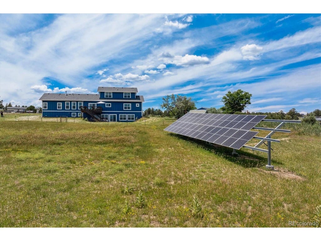 SPECTACULAR CUSTOM BUILT HOME on 5.33 acres in the Cross Diamond Acres community! OFF-GRID LIVING AVAILABLE!  Approximately 4,958 total sq ft includes 4 bedrooms, 5 baths, a main floor study & full walk-out basement. The stunning great room, with vaulted & beamed ceilings, showcases walls of windows & beautiful natural light. Enjoy the thoughtfully designed open layout with brick & shiplap fireplace surround, chandeliers plus recessed lighting, wide plank luxury vinyl flooring & Pella windows & doors. You'll love this expansive space, including the large dining room & the oversized seating/serving kitchen island with power on 2 sides. The kitchen's exceptional with white & knotty alder cabinets, 2 dishwashers, apron front sink, slab granite & black walnut butcher block counters, pull out cabinet shelves, mixer lift shelf with power, & 2 convection ovens. WOW! Relax in the main floor primary retreat with luxurious primary bath... marble countertop, undermount sinks, walk-in shower with bench, & a jetted, heated while circulating, soaking tub. A custom wood barn door leads to the main floor study with brick accent wall - fabulous for working from home! A 2nd main floor bedroom (or 2nd primary) with ensuite bath & large walk-in closet, a spacious laundry room, & mud room with built-in shelves & cubbies complete the main floor. Two generously sized bedrooms on the 2nd level share an adjacent bath. Enjoy beautiful views from the low maintenance deck, the low propane cost with owned propane tanks, & the owned solar panels, battery back-up ready, generating on average 100 kWh/day. Fully fenced & crossed fenced lot, with chicken coop, loafing shed, raised garden beds & more. There's plenty of space to add an outbuilding and/or barn. Low traffic Cross Diamond Acres community with quick access to equestrian riding & training, Parker, Elizabeth, shopping, dining & recreation. Custom designed, custom built, nothing else like it! Hurry to make this home yours!