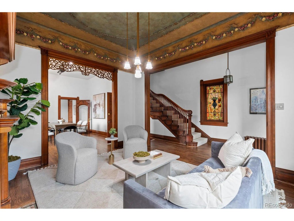 columned portico, arching second-story doors, and decorative frieze molding on the exterior, paired with soaring ceilings and incredible craftsmanship inside. Now known as the Guerrieri-De Cunto House and on both the National Register of Historic Places and the Historic Denver Register, it's been lovingly preserved and restored, evident immediately from the remarkable frescoed ceiling, carved floral motifs, unique lace wood trim, stained-glass window, and intricate metalwork fireplace-all original to the home. Yet you'll enjoy an uncommon amount of natural light for a historic home, plus all the comforts of brand-new carpet, fresh interior paint, new hardwood floors, and new light fixtures. With five bedrooms/offices (some featuring the home's original exposed brick), one-and-a-half-baths, a kitchen, a reception area and a conference room, this space accommodates both residential and professional aspirations. A detached two-car garage was originally the home's carriage house, and an ADA ramp in back provide convenience and accessibility. Enjoy savings and peace of mind in the recently replaced furnace, power-washed and cleaned exterior, and comprehensive security system.