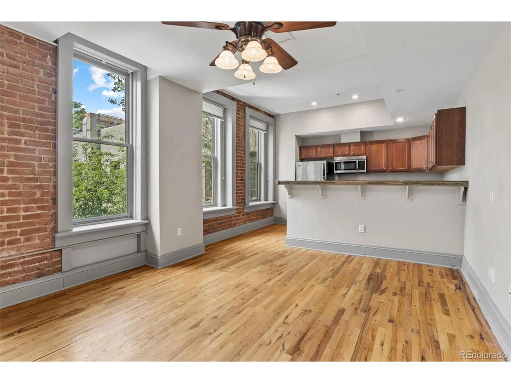 Right in the heart of it all! For those who want to be able to walk or bike to their favorite coffee shop, to catch the train, to the market, this one is for you! Inside the historic Weir Building, situated right on the corner of 32nd and Zuni, you'll enter at the sidewalk level and head up the stairs to this unit. One inside, you'll notice the grand ceilings and massive windows that let in tons of natural light. This unit overlooks the garden area, so windows open at night allow you to enjoy the Denver crisp evenings without the street noise. The kitchen with bar-top seating and concrete counters is situated to be able to enjoy guests while prepping snacks, and a full bath on the main level means you don't have to share all of your beauty secrets with your guests. Upstairs you'll find newer hardwood floors throughout both bedrooms and the hallway. A laundry closet with a newer, stacking laundry system is included and fits the space perfectly. The secondary bedroom has a sizeable closet that can be set-up with shelving or multiple hanging levels. The main bedroom is at the end of the hall, separated from the second bedroom by the completely updated bathroom with glass shower. *While there is no dedicated parking, there is often street parking available, and both surface lot and garage spot monthly rentals were available within a 6-minute walk (per Google Maps) as of Oct. 6th, between $90/mo and $174/mo.*