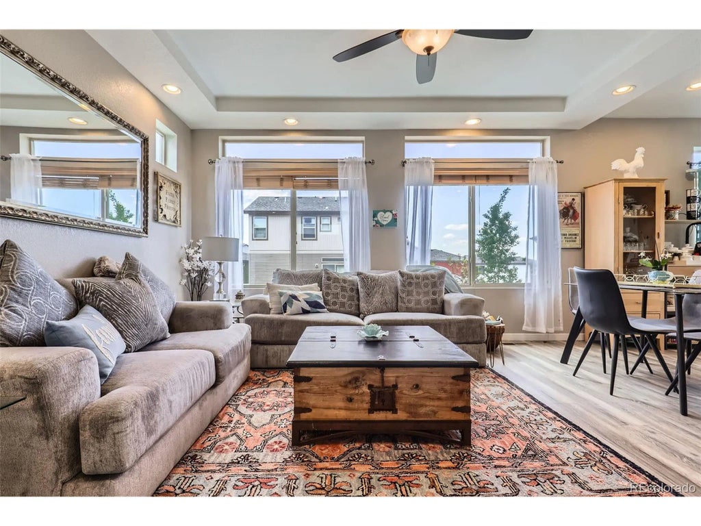 Welcome to this beautifully maintained 2-bedroom plus flex space, 2-bathroom home located in the heart of the vibrant Green Valley Ranch community. This stylish two-story residence offers 1,407 finished sq ft of modern living, complemented by thoughtful design and quality finishes throughout. Step inside to find expansive ceilings and rich vinyl hardwood flooring that flow seamlessly across the open-concept main level. The spacious kitchen features a large island with stunning granite countertops, stainless steel appliances-including a newer gas range-espresso cabinets, and a pantry, making it perfect for both entertaining and everyday living. Adjacent to the kitchen, enjoy your morning coffee or unwind on the private balcony, drenched in natural light from the home's many windows. The lower level includes a bedroom w/ walk-in closet, full bath, and additional flex space currently used as a (non-conforming) bedroom, ideal for guests or a home office. The upper level boasts a generous primary suite w/ its own bath and walk-in closet. A dedicated laundry room w/ side-by-side newer washer and dryer provides additional storage space and convenience. Recent upgrades include a new AC and roof, new carpet, and energy-efficient solar panels (third-party owned). Outside, the fully fenced backyard is a private oasis w/ a large poured concrete patio and even a small pond-ready to enjoy for the spring and summer months. A gazebo w/ decorative lighting is included, creating the perfect setting for relaxing evenings or weekend gatherings. Additional highlights include a 2-car attached garage and a location that puts you just minutes from parks, trails, the Green Valley Ranch Golf Club, and shopping. Enjoy quick access to the light rail and Denver International Airport-just a 15-minute drive away. With low-maintenance living, community amenities like a Rec Center, pool, and trails, and a home that's truly move-in ready, this is a rare opportunity to own a standout property.