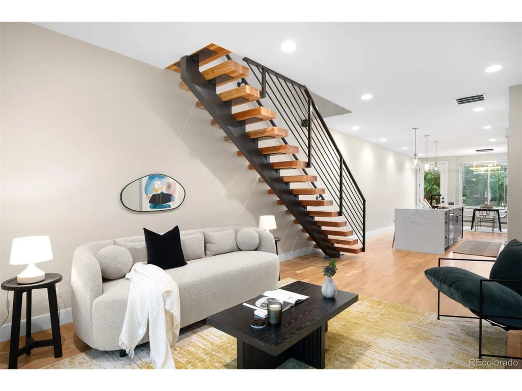 Will make a great primary home or investment property. Rents for $4,250 per month. This newer construction 3 bed / 4 bath home is just two blocks from the light rail and moments from all the restaurants, bars, and energy of South Broadway. With clean lines, luxe finishes, and panoramic mountain and city views from dual rooftop decks, it's a standout in both style and function. The open floor plan features real oak hardwoods throughout the main level and thoughtful, high-end details throughout. The kitchen includes soft-close cabinetry, a large eat-in waterfall island, custom black iron shelving, under-cabinet lighting, a pantry closet, and deluxe Bosch appliances. In the living area, enjoy a quartz-wrapped fireplace, pre-wired in-ceiling speakers, and a striking mono-rail staircase with wood treads and welded iron railings. Upstairs offers dual primary suites with designer tile, quartz counters, Euro-style glass showers, and modern lighting. Andersen windows bring in beautiful natural light on every level. The rooftop level features two private decks-one fully covered and west-facing with sweeping views of downtown and the mountains. Additional highlights include a central networking panel, high-efficiency furnace and water heater, central A/C, a 1-car garage with a WiFi-enabled opener and 220V EV charging outlet, and a private fenced yard with concrete patio, grass, and front/back sprinkler system. No HOA.
