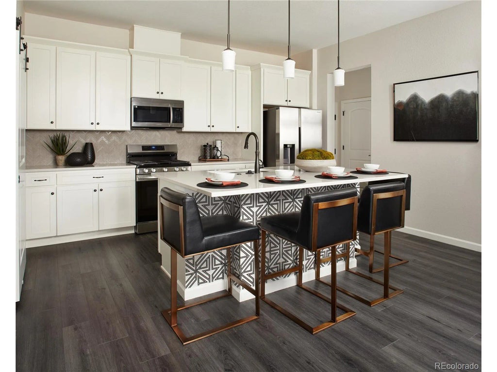 BEAUTIFUL CONDO-READY TODAY - Brand new condo with private stairs to extra-deep garage plus driveway parking. This sleek and modern unit faces east to welcome the morning sun and features our new Colorado Complete finishes including beautiful quartz countertops, gray soft-close cabinets, stainless steel appliances (including refrigerator), and full sized front-loading washer and dryer. High quality, easy care LVP flooring in a rich hue flows throughout the unit. Large kitchen island seats 4-5 and features an oversized stainless steel sink and semi-professional Kohler faucet. Brushed nickel hardware and fixtures add to the contemporary feel. Oversized subway tile in both baths and dual lighted mirrors in the spacious primary bath. This unit is move-in ready including blinds, air conditioning, Navien tankless water hearter, Kwikset Smartcode deadbolt and more. Easy access to E-470, I-70 and DIA. Take advantage of the great financing incentives available through our affiliated lender and get into a brand-new home for less than you would expect! Sales Center open everyday except Mon and Tues. Visit www.lokalhomes.com for more information. Photos are an example, not the actual unit. Buyer shall be responsible for verifying property taxes as there is currently no available tax information for the units at the assessor's website.