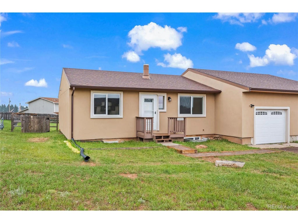 The spacious living area beckons with a ceiling fan and integrated lights, creating an inviting space to unwind. Large windows flood the room with natural light, framing breathtaking outdoor views, while a sleek modern electric fireplace promises cozy nights during Woodland Park's crisp winters. Step outside to the charming front porch with its white door and composite railing, flanked by sunlit windows, and envision relaxing with your morning coffee. The attached single car garage offers plenty of storage, and exterior lights add a welcoming touch, while the grassy backyard, framed by a wooden fence, hints at endless outdoor possibilities under a bright, clear sky. Enjoy the mountain views while BBQing on the back deck