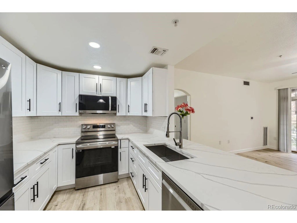 This wonderfully updated, ground-floor unit has a totally new kitchen with white cabinets, stainless steel appliances and a beautiful quartz countertop with waterfall edge. There is an eat-in kitchen as well. The living room has an inviting gas fireplace, a decorative wall and a patio that overlooks the greenbelt. There is new lvp flooring throughout the living areas and carpet in the bedrooms. The large primary bedroom has a walk-in closet and a patio. There is also a full bath with a garden tub and oversized countertop with two sinks. The homeowner even added subway tile in the laundry closet. There are no stairs to enter and live in this unit. Residents can enjoy a clubhouse, fitness center, pool, and spa. The complex is close to the fabulous Dove Valley Regional Park, which features a bike park, dog park, trails, and playgrounds. The community is within the highly coveted Cherry Creek School District. This home provides easy access to shops, restaurants, freeways and the quaint town of Parker and DTC are each only about 10 minutes away.
