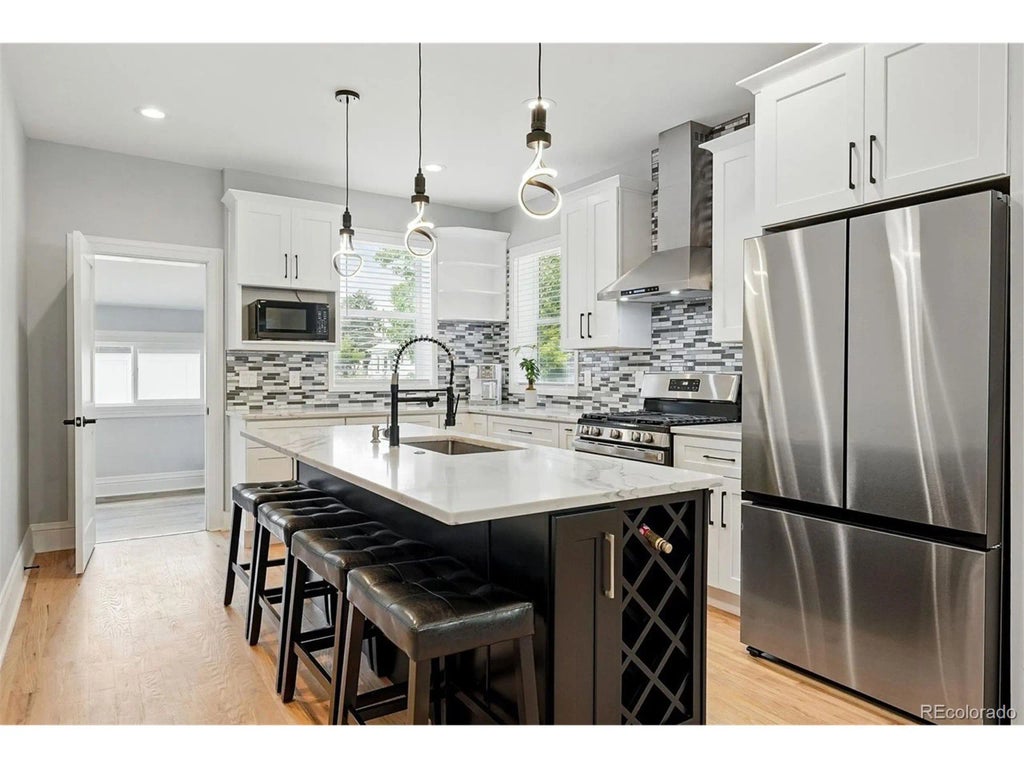 A corner lot in one of Denver's most beloved neighborhoods, this fully renovated bungalow blends historic charm with sleek modern updates. Located just minutes from Downtown, LoHi, and the Highlands, and within walking distance to parks, top-rated restaurants, shops, and highly regarded schools - it offers the best of city living and neighborhood warmth. Inside, the main level has been completely transformed with wood floors, brand-new windows, and an electric fireplace framed by custom built-ins. Sunlight fills the open-concept living, dining, and kitchen area, creating an inviting atmosphere perfect for entertaining. The kitchen shines with two-tone cabinetry, granite countertops, LED lighting, and a large island with bar seating. A private primary suite with an ensuite bath offers a peaceful retreat - a rare find in Sunnyside.