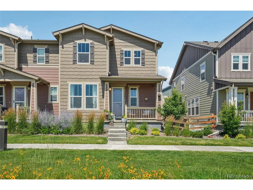 Welcome to this stunning duplex-style home in the highly sought-after Flatiron Meadows community of Erie. Perfectly positioned across from a lush green space, scenic trails, and the neighborhood playground, this home offers both vibrant community living and peaceful surroundings. A charming front porch with a sitting area and beautifully landscaped yard invites you to relax and enjoy the view.