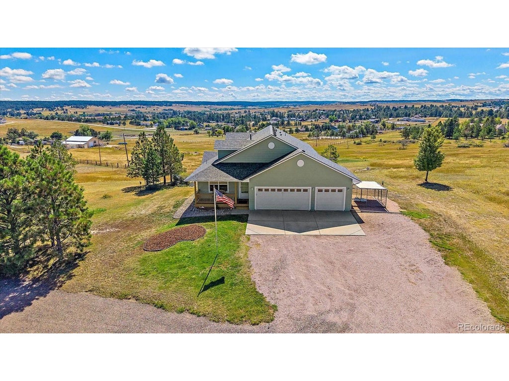 This exquisitely maintained ranch home offers the best of Colorado living-five acres of privacy, sweeping views of Pikes Peak, and spaces designed for both everyday comfort and memorable entertaining. An inviting open floorplan flows effortlessly, highlighted by custom concrete countertops in the kitchen and primary suite bath. The finished walk-out basement extends your living space with a generous recreation room, full wet bar, guest suite, and abundant storage. A three-car finished garage, pristine to the last detail, complements the home. Outdoors, a wraparound deck frames endless sunsets and starry skies, while a 40x60 insulated and powered shop with oversized door provides the ideal setting for RV storage, a workshop, or creative pursuits. Full enclosed outdoor pet kennel. Features newer systems and appliances, fully permitted enhancements, and a location just minutes from the heart of Elizabeth and an easy commute to Parker, this property combines elegance, convenience, and the timeless beauty of Colorado's landscape.