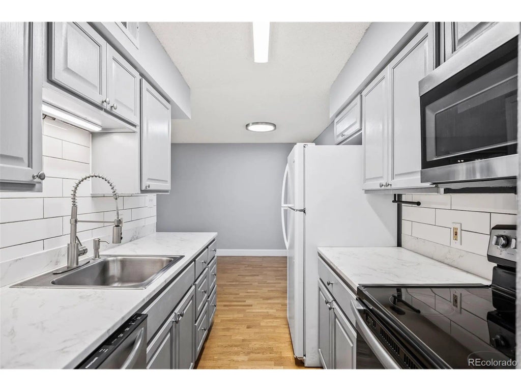 *.5 LENDER PAID INTEREST RATE BUY DOWN FOR ONE YEAR - CALL ERICKA YORK AT 828-691-0416 FOR MORE INFO* Welcome home to this beautifully updated 2-bedroom, 1-bathroom end-unit condo offering style, comfort, and convenience. Step inside to an open and airy floor plan filled with natural light. The kitchen features sleek gray cabinetry, marble-pattern countertops, and a classic white subway tile backsplash, perfectly blending form and function. A dedicated dining area flows into the spacious living room, where sliding glass doors lead to your own private balcony ideal for relaxing or entertaining. The primary suite offers a generous walk-in closet and direct access to the modernized full bath, which also features a secondary entry for guests. A second bedroom adds versatility, whether for additional living space, a home office, or guests. Enjoy access to a variety of community amenities including indoor/outdoor pools, tennis courts, and a clubhouse. Conveniently located near the Denver Tech Center and light rail, this condo is a perfect blend of comfort and connectivity. Don't miss the opportunity to make this home yours!