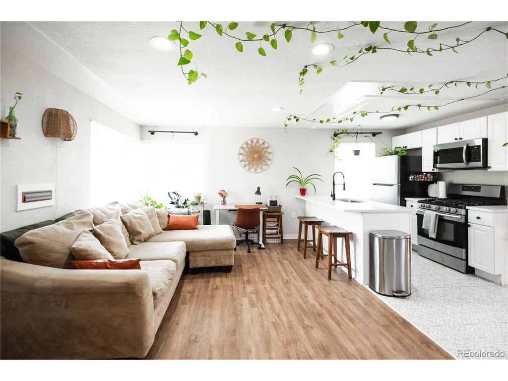Welcome home to this beautifully remodeled Denver townhouse, ideally located just minutes from Lowry and the Stanley Marketplace! Step inside to an open-concept floor plan featuring newer luxury vinyl flooring and a spacious living area perfect for relaxing or entertaining. The dining area offers plenty of room for a large table, while the stunning kitchen boasts newer white cabinetry, quartz countertops, and a peninsula island with seating-ideal for casual meals or morning coffee. The bedroom features newer carpet and is conveniently located near the in-unit laundry area. The full bathroom has been tastefully updated with custom tile work and a modern vanity. Enjoy a generous private backyard-perfect for pets, gardening, or weekend BBQs. Additional highlights include a newer A/C unit, roof, furnace, electrical panel, and updated windows for year-round comfort and energy efficiency. All you need to do is move in!