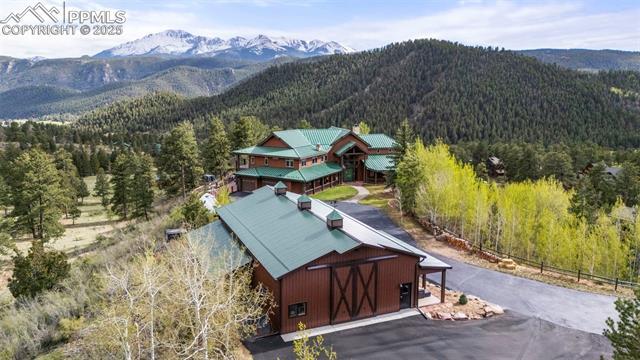 Situated on 3.02-acres, within the city limits of Woodland Park, CO this stunning estate boasts breathtaking views of Pikes Peak and offers private access to the National Forest, perfect for outdoor enthusiasts. Conveniently located just minutes from all modern amenities, this home offers a peaceful atmosphere. The centerpiece of the property is a beautiful 5,497 square foot mountain lodge-style home featuring six bedrooms and six bathrooms that provides ample space and comfort. The residence was thoughtfully designed to maximize the panoramic mountain vistas from nearly every room. The heart of the home boasts soaring cathedral ceilings in the great room with charming log accents and an inviting fireplace, creating a welcoming atmosphere. The gourmet kitchen is sure to impress even the most discerning chefs. The home provides two master suites and a guest suite. The main floor master suite is currently utilized as a recreation and game room. This portion of the home includes a five-piece bath, walk-in closet, an bedroom/office and dedicated workout room. The second floor hosts the second primary suite, 2 additional bedrooms with attached bathrooms and walk-outs to deck space, and a quiet office. The guest suite contains a convenient kitchenette, dedicated bathroom, small study, and a bedroom with access to a deck rounds out the second floor. Outdoor highlights include a newly added and custom-designed 36x64 heated RV shop/garage, a Planta greenhouse, a resort-style fire pit, and large swim spa. Adding a touch of charm, is a creatively repurposed gondola from Steamboat Springs Ski Resort, providing a memorable hangout spot. This combination of characteristics is extremely rare in the Woodland Park market. Colorado Springs is a short fifteen minute drive to the east, and the Colorado Springs Airport is easily accessible within a forty-five-minute drive. Recreation abounds here as this is a vacation destination. This is a truly exceptional Colorado estate!