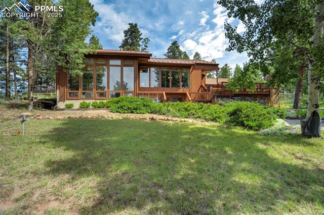 Unmatched Pikes Peak Views & Thoughtful Sustainability. Tucked at the end of a quiet cul-de-sac, this beautifully maintained home offers panoramic Pikes Peak views and a true Colorado mountain lifestyle. An expansive deck, sun-filled living spaces, and warm natural finishes create a sense of comfort and connection to the outdoors. The sunroom is a highlight—passively heated and surrounded by windows, offering year-round brightness and warmth. Inside, the kitchen features solid hickory cabinetry, solid core doors, a new range/oven, and new wood flooring. Hardwood floors and ceramic tile extend throughout the main level, which includes a primary suite with dual walk-in closets and direct views of the sunroom and mountains. The main-level hall bath includes granite counters and a striking copper bowl sink. The walk-out basement offers two additional bedrooms, a full bathroom with granite and tile, a cozy gas stove, and a piano that stays with the home. The oversized garage fits large trucks, includes a workshop, utility sink, storage loft, and extra pantry space. The fenced backyard is an absolute gem: mature trees, gardens galore, and a greenhouse/covered sitting area. The gardens are supported by a rainwater cistern system that provides non-chlorinated watering. A solar setup powers select appliances and includes battery storage, offering eco-conscious efficiency. A new metal roof, freshly painted exterior, and paved driveway add to the home’s durability and charm. This is mountain living at its best—private, practical, and filled with pride of ownership, all just minutes from the heart of Woodland Park. Come take a look, be sure to take the 3D tour too!