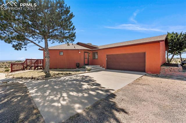 This Pueblo West gem is located on 1.82 acres atop a bluff, offering sweeping views of both Pueblo West and the majestic mountains beyond. With 2 bedrooms, 2 bathrooms, and an oversized 2-car attached garage, this home is as unique inside as it is outside. A long, private driveway sets the stage for a serene retreat. Inside, the open floorplan connects the living, dining, and kitchen areas beneath vaulted ceilings. The living room features cozy carpeting, while the kitchen offers abundant cabinet space and a gas range oven—perfect for cooking and entertaining. The split floor plan provides privacy, with the primary suite featuring a walk-in closet, an attached ¾ bath, laundry area, and direct access to the sunroom. On the opposite side, you’ll find a second bedroom with its own walk-in closet, access to the sunroom, and a full bath. A highlight of this home is the expansive sunroom with heated tile floors, designed to keep the space warm in the winter. Combined with passive solar, it creates an energy-efficient touch. From here, step out onto the peaceful wraparound deck to soak in the panoramic views. The full, unfinished walkout basement provides endless possibilities—whether you envision extra living space, a workshop, or storage. This is more than just a home—it’s a tranquil retreat with incredible potential.