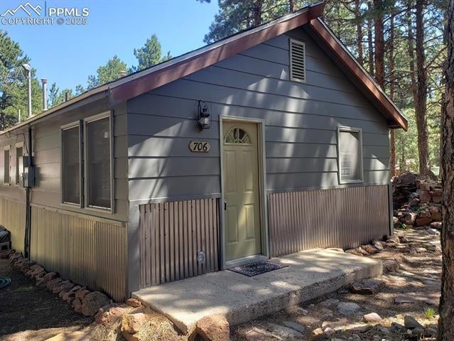 Serene setting, updated yet rustic, and you can walk to everything...shopping, dining, entertainment. Fresh exterior paint, and new raw steel corrugated siding which will rust quickly to a mountain rustic patina. Cute 2 Bedroom, 1 Bath home in an incredible location and on a large, secluded, and quiet wooded lot! Close to all the amenities of downtown Woodland Park. Original hardwood floors, and tongue and groove wainscoting. Kitchen upgraded about 8 years ago with granite, some stainless steel, and new cabinets. New dishwasher Aug 2024, and refrigerator is just a couple of years old. Tower washer and dryer included. Wood burning fireplace. Furnace replaced in Jan 2022. Also new carpet in the master, with the remaining flooring being wood or tile. Sewer line just repaired, roof inspected last week (copy available upon request), and new water line installed in 2023. So the hard work has been done, but still an opportunity for you to add your personal touch and make this home amazing. Furniture and kitchen set up items remain, including a tv, entertainment center, and real leather reclining couch. Plenty of off-street parking and a large detached shed. No HOA. Not many opportunities to find a home in wonderful Woodland Park at this price point!