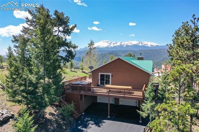 STUNNING PIKES PEAK VIEWS! This beautiful home in Paradise Estates and the surrounding mountains offers some of the best views in Woodland Park. This immaculate bi-level home has numerous upgrades to include: a 30 year Metal Roof, beautiful Hardwood floors in the upper level to include the kitchen and living room. The kitchen is appointed with all Stainless Steel Appliances including a gas range, microwave oven, refrigerator, dishwasher, under mount double sink, Granite countertops throughout and separate island with breakfast bar. Also included is a convenient pantry next to the refrigerator. Loads of cabinet space as well. The living room has a beautiful Moss Rock Fireplace with a gas insert. The room has large windows for your viewing pleasure as well as great natural light. There is a walk-out to an enormous deck with southwestern views with a great spot for entertaining throughout the year. There are 3 bedrooms on the upper level. The master suite walks out to the deck and hot tub. Master bath contains dual vanities, a walk-in shower with tile surrounds and radiant heated floor. 2 other bedrooms and a nicely appointed bathroom with granite counters and nice tile are located on the upper level. In the lower level you will find a cozy family room with an electric fireplace feature, a fourth bedroom, a bathroom, and laundry room. Additional storage can be found in the garage. There are actually 4 parking spaces. 2 inside the garage and 2 outside in the covered carport. The home is tastefully decorated with a warm color scheme and wonderful personal touches. The home is situated on a 0.83 acre lot to include a split rail fence. The landscaping is all natural and low maintenance. Wildlife abounds in the area. Come enjoy the allure of the Mountain Charm and the stunning vistas. Take a look at the Drone Video and 3D walk-through of the home. A floor plan is also attached for your reference. Come take a look at this wonderful home.
