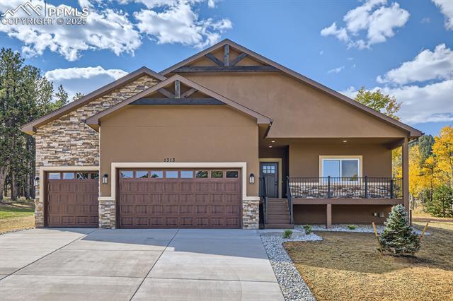 Welcome to convenient mountain living on a corner lot in the desired neighborhood of Stone Ridge Village in Woodland Park, CO. This brand new ranch style home features over 2,000 sq. ft., 4 bedrooms, 2 bathrooms, and 3-car garage all laid out in an open floor plan. You will be greeted by a covered entryway into a large foyer that opens up to the expansive open floor plan. You'll notice the great room that has a high efficiency 35,000 BTU gas fireplace (will effectively heat the entire home) finished in floor-to-ceiling stone, a walk-out dining room, a top-notch kitchen with superior granite countertops & custom soft-close cabinetry, a large island and a walk-in pantry. As you enter the home, on your right, you'll see a well-lit office that can also serve as a functioning bedroom. Every detail was thought out in this home to include upgraded insulation, tankless water heater, solid core doors, a radon mitigation system, custom soft-close cabinetry, granite countertops, heated crawl space, engineered flooring, a large linen closet in the master bathroom, landscaping, and upgraded Mezzo windows. Notice in the oversized 3-car garage the electric car charger, the epoxy covered floors, and the hot/cold spigot making it easy to wash your car. Enjoy the Colorado air by stepping onto the large covered patio that overlooks your already established yard and is accessible from both the dining room and the master bedroom. There is nothing that this home and floor plan doesn't offer - plenty of space for entertainment, guests visiting, individual space for quiet time, work-from-home space, food storage, work space in the garage, and a large corner lot located just minutes from everything Woodland Park has to offer.