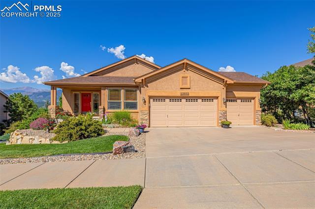 UNMATCHED Front Range views, refined finishes, and a seamless ranch-style layout — this home captures the very best of Colorado Springs living! This stunning home features unobstructed views of the entire Front Range, including the majestic Pikes Peak, from the covered composite deck. The views can also be enjoyed from the Kitchen, which features a large island with quartz countertops and backsplash, 42" maple cabinets with crown molding, touchless faucet, under-cabinet lighting, and a convenient appliance nook with outlets. Premium GE Profile appliances—including double ovens, induction cooktop and a 3-drawer refrigerator— will satisfy any home chef. The Main Level also offers real hardwood floors, gas fireplace, a stunning separate Dining Area, and vaulted ceilings to highlight those views. The primary suite is a true retreat, sharing the same dramatic Pikes Peak view, with separate deck access, a luxurious five-piece bath, and a massive walk-in closet with heated floors and custom closet system. The heated floors continue into through the Bath, Closet and into the mud room, which features a utility sink. The fully finished walkout basement extends the living space, offering its own stunning mountain views, abundant storage across three areas, and recessed lighting throughout. The secondary bedrooms are spacious, and the curb appeal is spectacular. A rare find, this home features exquisite touches throughout! Enjoy the home's elegance, functionality, and Mountain Contemporary style in one of the premier neighborhoods in Northgate- Middle Creek! Welcome Home.