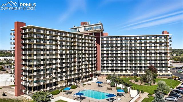 Enjoy a fabulous opportunity to own a truly distinctive 1-bedroom, 1-bathroom condo in one of the area's most iconic buildings. Nestled in the historic Satellite Hotel, this unit offers endless potential and panoramic views that will leave you speechless. Step onto the expansive covered balcony and take in unobstructed vistas of snowcapped Pikes Peak, the majestic Front Range, golf course, and sparkling city lights at sunset. Whether you're enjoying your morning coffee or entertaining guests in the evening, this outdoor space is a showstopper. Inside, the condo features a light-filled, open floor plan perfect for relaxing or hosting. The spacious living room flows seamlessly to the balcony, while the kitchen includes a smooth-top range, vent hood, and refrigerator. The generously sized bedroom boasts a walk-in closet and private access to the balcony, and the full bathroom offers a tiled tub/shower combo and vanity. This unit is a blank canvas, ready for your personal touch. With central air and hot water heat, year-round comfort is guaranteed. Private locked cabinets on the balcony provide extra storage, and the building’s incredible amenities elevate everyday living: enjoy access to a pool, sauna, gym, billiard room, library, tennis courts, bar, restaurant, spa, laundry facilities, and security. All utilities (electricity, heat, and water) are included in the monthly HOA dues. Located near the Valley Hi Golf Course, this condo is just minutes from local shopping, dining, entertainment, and major landmarks like downtown Colorado Springs, Garden of the Gods, Palmer Park, & the US Olympic Training Center. It also offers easy access to military installations, making it an ideal choice for those seeking convenience and scenic living. This delightful condominium offers the perfect mix of charm, potential, and unbeatable views. Bring your vision and transform this diamond in the rough into your dream home.