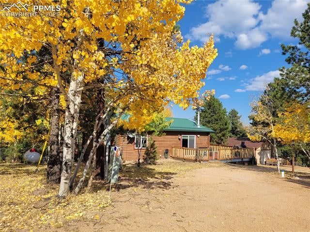 Mountain log cabin in the woods, bordering National Forest w/ access to ATV trails from the back yard! Excellent views of Pikes Peak, you won’t want to miss!! Located 15 minutes outside of Woodland Park on .71 acres of land. Upgrades to the cabin include: New luxury vinyl plank flooring & new linoleum flooring; new lighting throughout; new woodburning stove w/ stacked stone hearth and mantle; many new windows and doors; Newer wrap-around deck on 3 sides w/ doggie ramp to a fenced rear yard; newer appliances; new countertops, sink and disposal; newer furnace and hot water heater; new walk-in custom tiled shower & new commode & vanity. An oversized detached 2 car garage is onsite, both insulated & wired with electricity, & includes a Timberline woodburning stove. 660 sq ft finished shed. This mountain getaway has so many attributes to offer and can make for the perfect getaway! Fire mitigated land. Take a peek at what mountain living and fresh air can do for you! Community water supply and septic system service the property. Neighborhood improvement's are in process, see agent comments.