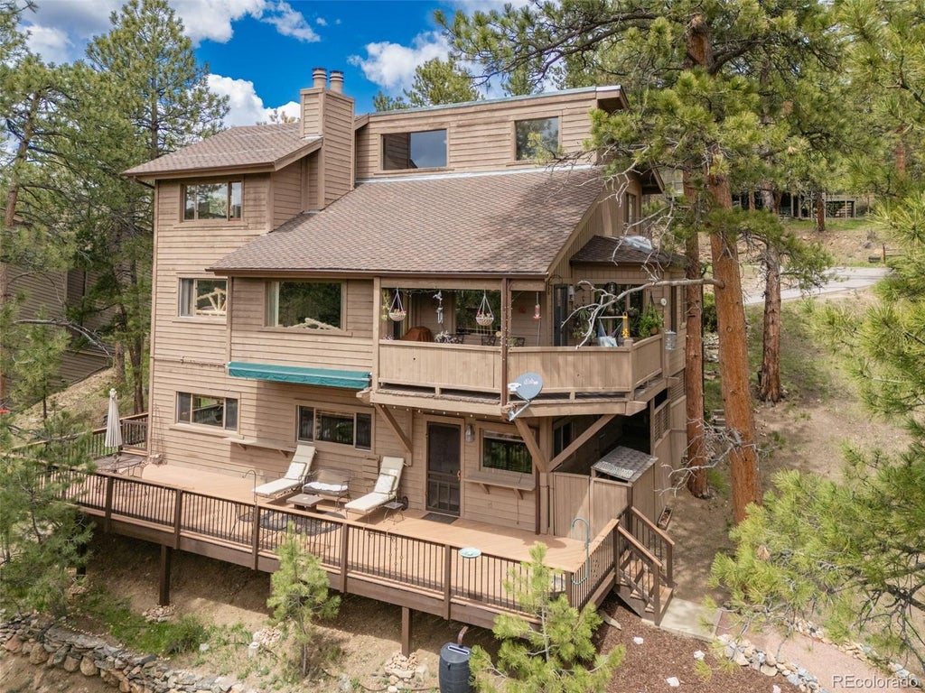Welcome to 4198 Timbervale Drive in Evergreen! Nestled in the highly sought-after Timbervale neighborhood, this beautiful home offers the perfect blend of comfort, community, and convenience. Just a short stroll to downtown Evergreen, you'll enjoy charming shops, dining, and events, all while being adjacent to the Hiwan Homestead Museum and expansive open space. The neighborhood features fantastic amenities including a barn, playground, and sport court, fostering a close-knit community atmosphere. This spacious 4-bedroom, 4-bathroom residence has been thoughtfully upgraded over the years. Recent improvements include a new roof, interior and exterior paint, new electrical panel, new hot water heater, and a stunning large composite deck that offers panoramic views of the homestead museum and open space—perfect for entertaining or relaxing with family and friends. The main level is designed for ease and comfort, featuring a recently remodeled eat-in kitchen with a sunroom and a generous pantry, a formal dining room, a cozy living area with gas fireplace, and a primary suite with a large bathroom and dual closets ensuite. Upstairs, you'll find two additional bedrooms—one with a fun loft—plus a recently updated bathroom, ideal for family or guests. The walk-out lower level provides an additional private bedroom and a spacious bathroom which includes an additional room wired and reserved for a future sauna. Entertain in style in the custom full bar area with then step outside onto the new deck to soak in the breathtaking sunset views. The expansive outdoor area, thanks to its proximity to open space, offers a feeling of a large private yard without the burdens of maintenance, making it an ideal outdoor sanctuary. This home seamlessly combines modern upgrades with a vibrant community setting—making it the perfect place to call home in Evergreen.