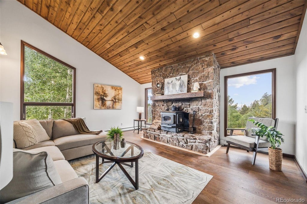 Tucked into the trees with peaceful mountain views, 659 Hyland Drive is your Evergreen escape. This 3-bedroom, 2-bathroom home offers 2,322 sq ft of rustic charm and modern comfort. The open-concept living area features soaring wood ceilings, a dramatic floor-to-ceiling moss rock wood-burning fireplace, and plenty of natural light. Upstairs, the updated kitchen shines with granite counters, hardwood floors, a butcher block island, and ample storage. Enjoy meals with a view or step out onto the wrap-around balcony deck to watch wildlife and soak in the scenery. Two upper-level bedrooms include a primary bedroom with skylights, two closets, bath access, and a secondary bedroom complete with heat pumps for cooling! The walk-out lower level offers a spacious family room with wood stove, another primary/guest bedroom or office with en-suite ¾ bath. Additional highlights: oversized two-car garage, new flooring, all new kitchen appliances, heat pumps for cooling, paved driveway, only 10 mins to grocery store and easy access to I-70,Denver, and Colorado's best mountain adventures. Private, peaceful, and move-in ready -come experience Evergreen living. You'll love living here!