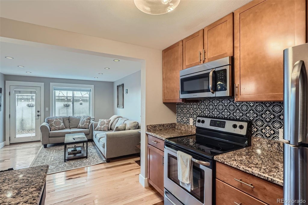 Welcome to Carlyle Flats in LoHi, where modern upgrades meet urban charm. This 2-bedroom, 1-bath condo offers an inviting open floorplan with warm hickory hardwood floors, granite counters, and modern recessed lighting throughout. The spacious private patio, enclosed with 6-foot privacy fencing, is perfect for morning coffee, grilling, or entertaining. Inside, enjoy the convenience of in-unit laundry, ample storage, and a well-designed layout that maximizes the 599 sq. ft. of living space. The updated kitchen includes stainless steel appliances, while the bright living room flows effortlessly outdoors to your private patio. Practical perks include heat and water covered by HOA dues, secure gated entry, bike storage, and your own reserved parking spot (#11) in the gated lot. Situated in the heart of LoHi and the Highlands, you’re steps from Denver’s best dining, shopping, and nightlife — from brunch at Happy Camper to cocktails at Linger, sushi at Sushi Ronin, or ice cream at Little Man. Easy access to downtown via the Highland Bridge gives you the best of both neighborhood charm and city convenience. This condo delivers the perfect blend of style, comfort, and location in one of Denver’s most sought-after neighborhoods.