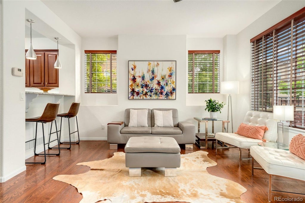 Located in the Brownstones at Town Center, this spacious end-unit townhome stands out with the largest floor plan available, abundant natural light, and a quiet, private setting. The main level features wide-plank wood flooring and a seamless flow between the living room—complete with a gas fireplace—and the kitchen, which includes cherry cabinetry, granite countertops, stainless steel appliances, an island, and a breakfast bar. A main-level room with a full bath and bright western exposure is ideal for guests, a home office, or even a small bedroom. Upstairs, the primary suite includes a walk-in closet and a private five-piece bath. A flexible loft space sits between the second upper-level bedroom and a full bath, making it great for a media area or second workspace. Outdoor areas include a shaded front patio with mountain views and a fenced courtyard between the home and detached garage. Unique to this unit, the air conditioner has been relocated to the exterior wall—freeing up space and minimizing noise on the back patio for a more peaceful outdoor experience. Set away from direct parking and traffic noise, this end unit feels tucked-in and private year-round. The unfinished basement includes a sump pump and crawl space for added storage. Energy efficient and low maintenance, with everyday amenities just steps away—grocery stores, restaurants, parks, trails, and medical services—plus quick access to major routes for trips to the mountains or airport.