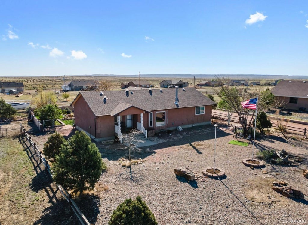 Welcome to your dream home! This modern ranch, nestled in Pueblo West, offers a serene lifestyle with breathtaking mountain views from the covered patio to all around the home. Step inside to discover an open-concept living space bathed in natural light, enhanced by solar tubes and a cozy wood-burning gas fireplace. The chef's kitchen boasts granite countertops, a spacious island, and nearly-new stainless steel appliances. Enjoy the convenience of a spacious laundry room leading to an oversized 3-car garage with a private workshop. The private master suite features a walk-in closet, adjoined luxurious 5-piece bathroom, a standing tub for a well deserved self care day. Energy efficiency is key with fully-paid solar panels and a smart thermostat. Benefit from the emergency solar battery backup system, ensuring power during outages. Enjoy peace and serenity outside, find a fully fenced xeriscaped front yard, a fully concreted covered backyard, separated dog barn, rose garden, and fruit trees on an auto-drip system. Decked with a built-in gazebo to enjoy the pikes peak mountain views. All on a sprawling A-3 zoned lot perfect for agricultural activities such as farming, livestocks or horses. This property offers the best of small country living with room to grow. This is more than a home, its a lifestyle! Contact me for a private showing Gloria 719-654-2433