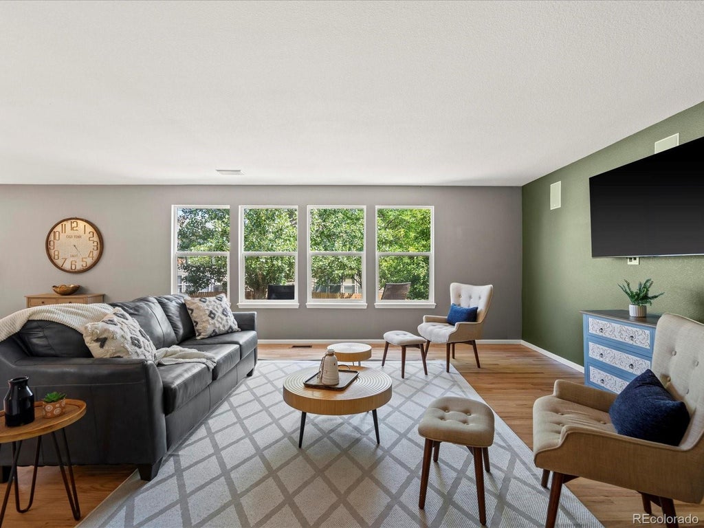 Welcome to this spacious and beautifully updated two-story home featuring stunning hardwood floors throughout the main level and an inviting open floor plan. The handsome kitchen boasts stainless steel appliances, a pantry, and a cozy breakfast nook, perfect for casual dining. Upstairs, you’ll find three bedrooms, two bathrooms, and a versatile loft space— ideal for an office, playroom, or second living area-while newer carpet adds comfort throughout. The primary suite offers a walk-in closet and en-suite bathroom. The partially finished basement provides excellent potential with drywall and electrical already installed, it includes a large great room, utility space, and a possible fourth bedroom with an egress window. Enjoy the fully fenced backyard complete with an oversized Trex deck and a mature shade tree—perfect for relaxing or entertaining. Numerous smart and tech upgrades include surround sound, security cameras, smart lighting, Ring doorbell, smart garage door opener, and fiber optic internet. Plus this home includes a reverse osmosis filtration, a humidifier and solar panels, which will be paid off by the seller at closing. Located near trails, four parks, and a recreation center, with a low-cost HOA—this home truly has it all!