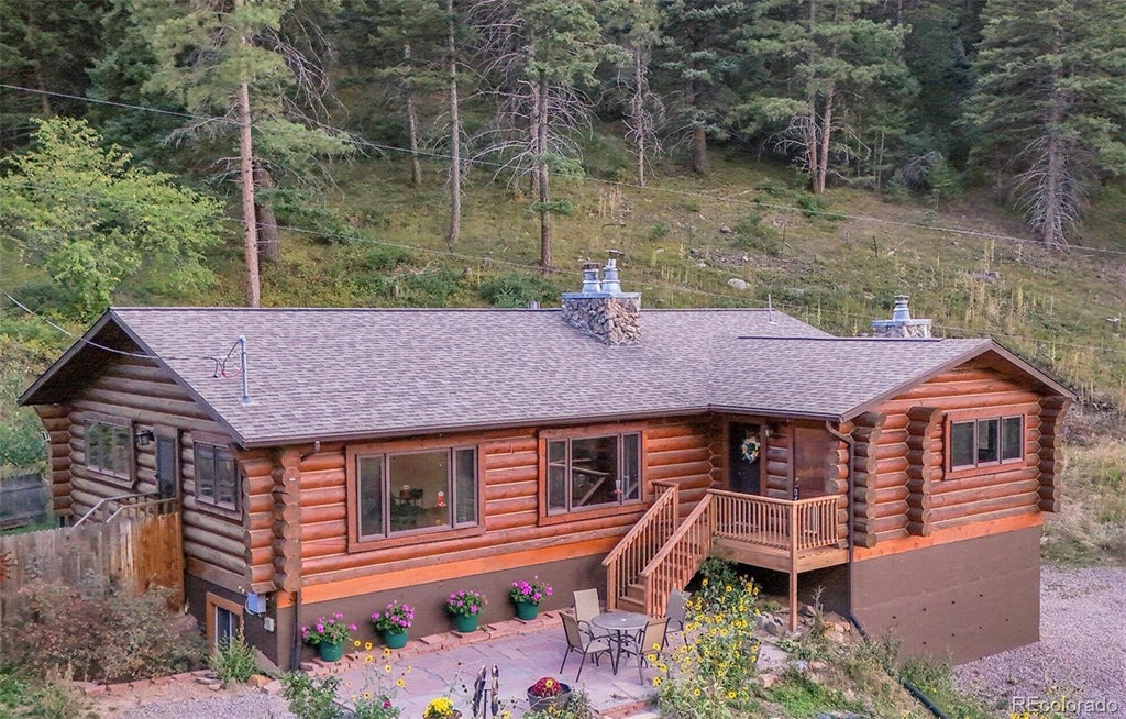 Nestled in the serene western foothills of Littleton, just 20 minutes from C-470, this remarkable 4-bedroom, 3-bath log home combines modern technology, luxurious comforts, and true Colorado charm. Set on 15+ acres of legal horse property, it showcases vaulted ceilings, beetle-kill pine accents, a striking stone fireplace with blower, and an open floor plan that connects the living room, dining area, and gourmet kitchen. The kitchen features stone counters, a hidden pantry, stainless appliances, a wine fridge, and custom quarter-sawn oak cabinetry.
