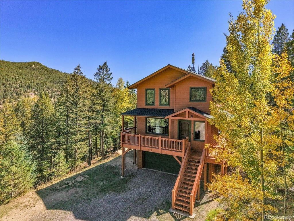 Tucked away in the desirable West Highlands neighborhood of Evergreen, this lovingly maintained one-owner home offers the perfect blend of privacy, peaceful mountain living, and convenient access to town, all while benefiting from the lower tax rate of Clear Creek County. Sitting on 4.71 pristine acres surrounded by natural beauty, the home offers a tranquil and secluded setting with expansive mountain views and endless opportunities to enjoy the outdoors. Enter from the spacious, partially covered main deck, ideal for relaxing mornings or quiet evenings taking in the serenity. Inside, the main level features hardwood flooring, a large sunlit living room with built-in shelving, and a gas fireplace. The dining area opens to a smaller deck, perfect for grilling, and flows into a well-appointed kitchen with tile counters, stainless appliances, and a conveniently located half bath. Upstairs, the primary suite offers mountain views, a walk-in closet plus a second closet, and a spacious ensuite bath with jetted tub, dual sinks, tile flooring, and separate shower and toilet room. Two additional bedrooms and a full bath complete the upper level. The finished walk-out lower level includes a flexible family room, 3/4 bath, and a laundry room with utility sink. The attached two-car garage includes a separate utility room with exterior access. Extras include a brand-new roof, a newer upgraded hot water tank (2023), and high-speed internet through Clear Creek Broadband with repeater site advantage. No HOA. Homes like this in West Highlands rarely come to market, don’t miss this opportunity.