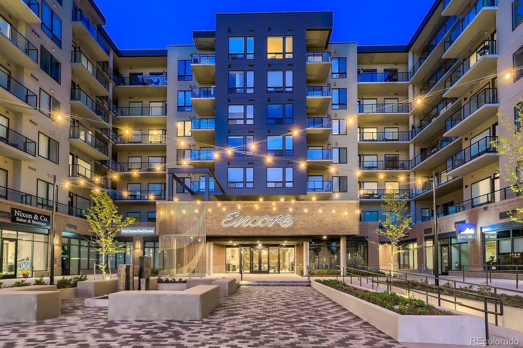 Step into this stunning 2-bedroom, 2-bathroom condo in the sought-after Encore building in Castle Rock. With southern exposure and abundant natural light, this open loft-style floor plan is both functional and inviting. The heart of the home is the chef’s kitchen complete with KitchenAid appliances, an abundance of cabinetry, and gorgeous quartz countertops designed for both everyday living and entertaining. The kitchen seamlessly flows into the dining area and living room, all framed by wide luxury vinyl flooring and opening out to a private south-facing balcony overlooking the rooftop pool and lush courtyard. The primary suite is a serene retreat, filled with natural light and featuring a large walk-in closet. The second bedroom offers flexibility which is perfect for a guest room, office, or creative space. The convenient laundry area is tucked away in the hallway, keeping functionality at the forefront. Encore is more than just a building it’s a lifestyle. Enjoy a resort-style pool, a state-of-the-art fitness center, an elegant clubhouse with a full kitchen and pool tables, plus a dog park and dog wash station for your four-legged family members. Just to name a few extras 6 ev charges in the garage parking area. A few pool tables and the golf simulator for you golfers. Right outside your door, enjoy your morning coffee at the local coffee shops, shop the local boutiques, take long walks on the trails, enjoy the awesome restaurants featuring happy hour, an abundance of festivities at Festival Park, including a seasonal Farmers Market, right next door. Most of all, the great neighbors.